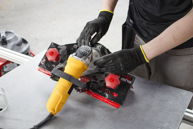PRO-EDGER se pričvršćuje na kutnu brusilicu pomoću M14 navoja i brzog remenskog sustava, a stabilna konstrukcija omogućuje ravnomjerno vođenje alata uz rub pločice. Sustav kliznih vodilica i ležajeva olakšava kretanje po rubu materijala i pomaže dobiti ujednačen završni rezultat. Uređaj je kompatibilan s većinom električnih i akumulatorskih mini brusilica, a preporučuje se uporaba alata snage oko 850 W za najbolju kontrolu i stabilnost tijekom rada.